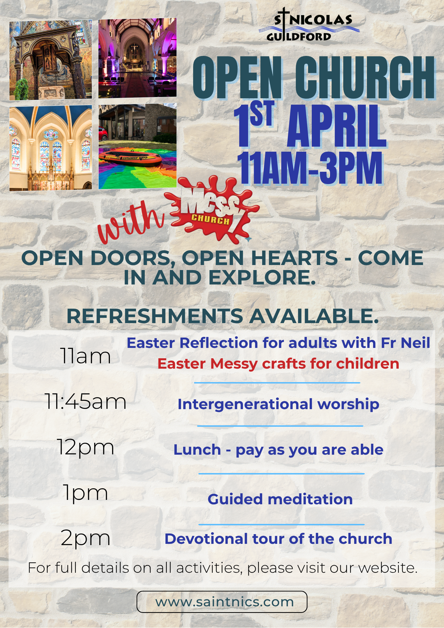Parents and carers are welcome to accompany their child during our Messy crafts, or you can grab a drink, leave your child with us, and join Fr Neil for Easter reflections. At 11:45am we will pause for intergenerational worship with Fr Neil and Nicky, our Mission Enabler.